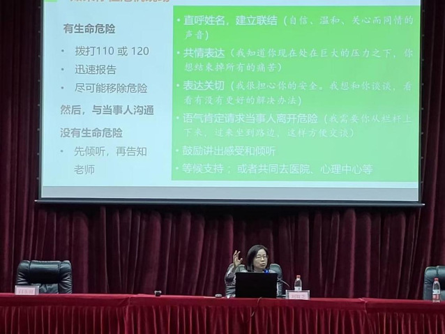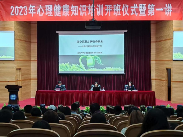 为进一步完善我校“学校-学院-班级-宿舍”四级心理健康教育网络,强化大学生心理危机预防与干预长效机制,马克思主义学院大学生心理健康教育与咨询中心于11月8日下午在图书馆大报告厅举行了2023级心理气象员培训班开班仪式。马克思主义学院副院长杨劲艺参加了开班仪式,并邀请了河海大学心理中心主任刘取芝讲授了《做心灵卫士 护生命安全》的主题讲座。开班仪式由心理中心教师闫永田主持。