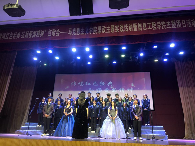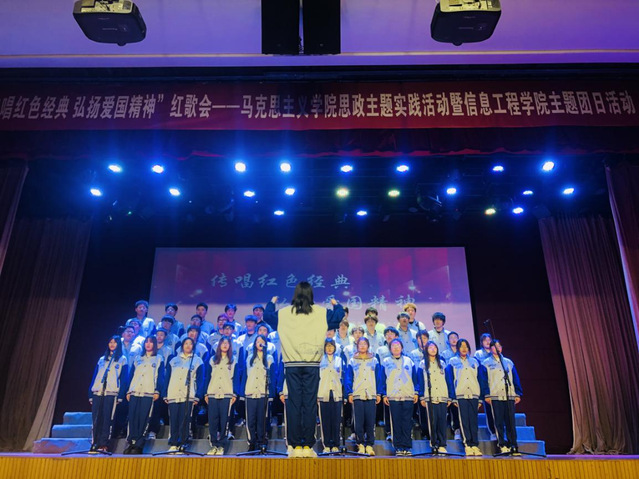 11月29日晚,校大学生活动中心里歌声嘹亮、激情飞扬,马克思主义学院携手信息工程学院顺利举办了一场思政主题实践活动——“传唱红色经典 弘扬爱国精神”红歌会,信息学院2023级的全体学生及积极分子代表参加了本次活动,共选用16首经典的红色歌曲,采用班级大合唱的形式回顾党在成长壮大时期的艰难坎坷,歌颂在党的领导下祖国的日益强大。