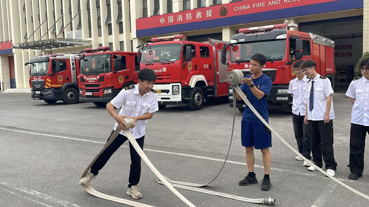 在实操体验环节,同学们尝试打水带与收水带操作。看似简单的任务,实际操作起来却困难重重,不少同学连基本的公母接口都分辨不清。这让大家明白,消防工作的每一项技能都需要经过长时间的训练才能熟练掌握。